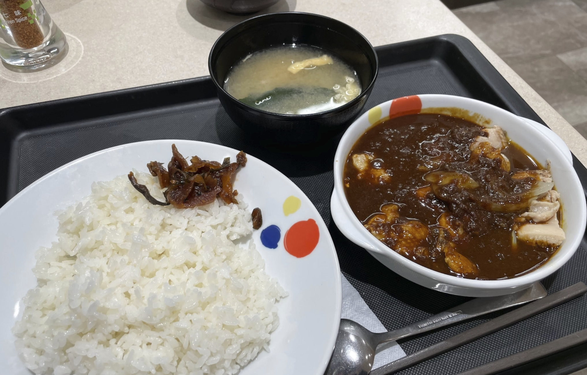 ライスに福神漬け、チキンカレー皿、味噌汁がついています
